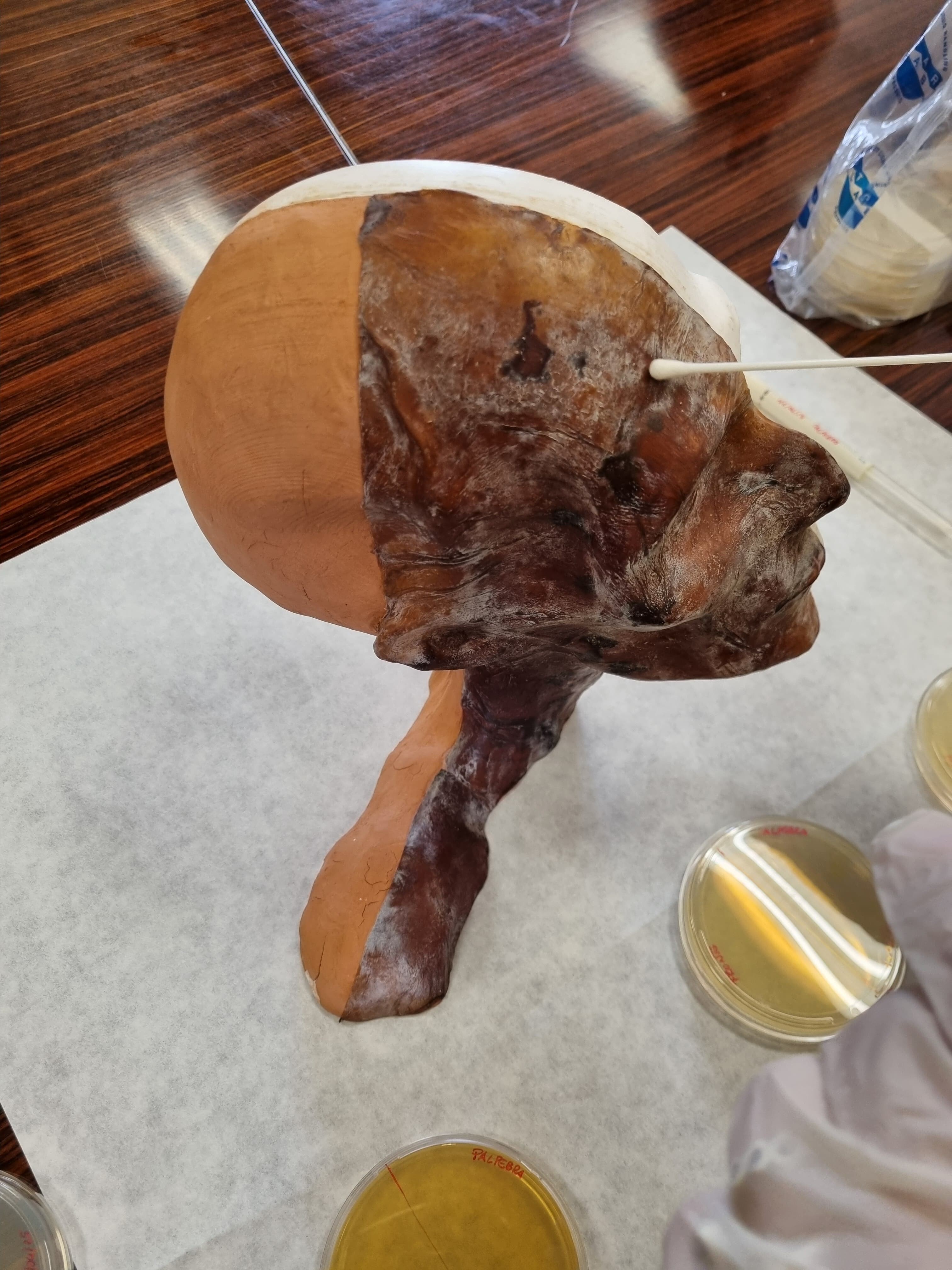 A causare la contaminazione della ‘pelle’ della mummia, realizzata da un laboratorio della Sapienza Università di Roma, è stato il contatto con le mani dei visitatori, che hanno potuto toccare la copia a scopo didattico durante le varie esposizioni al pubblico, tra cui quella al Museo del Vicino Oriente, Egitto e Mediterraneo (VOEM). Il trattamento è stato effettuato nell’impianto di irraggiamento Calliope del Centro Ricerche ENEA Casaccia (Roma), presso il quale nei prossimi mesi sarà trattata anche la riproduzione dell’intera mummia.